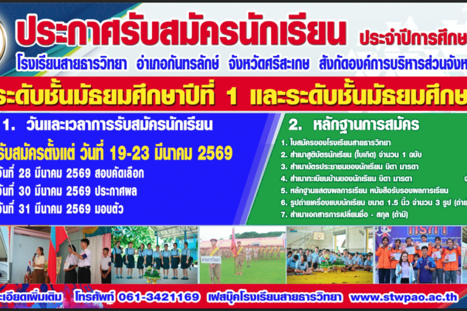 ประกาศรับสมัครนักเรียน ม.1 , ม.4 ปีการศึกษา 2569by admin6 March 20266 March 2026รายงานการรับนักเรียน ม.1,ม.4 ปี 2569 ติดต่อ-สอบถาม งานประชาสัมพันธ์โรงเรียนสายธารวิทยา